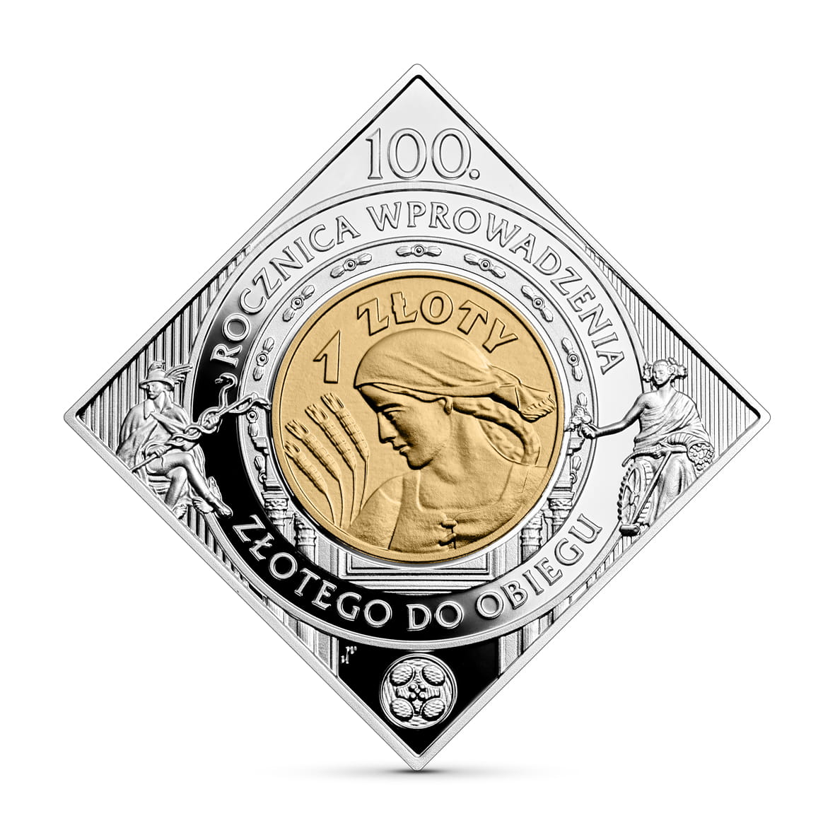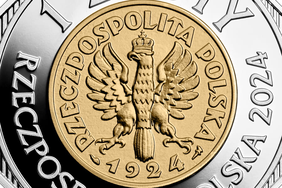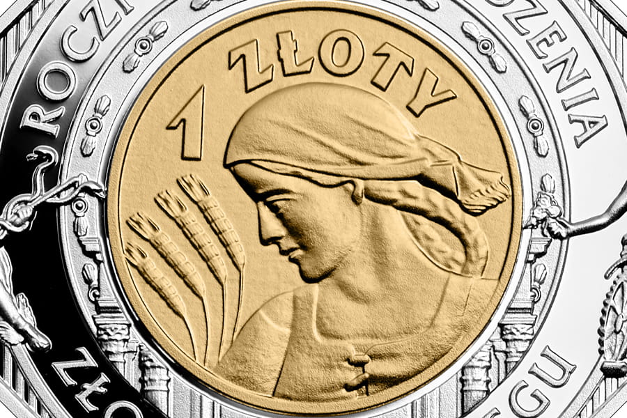 Moneta srebrna, selektywnie złocona: 1 zł / 2024 r. - 100. rocznica wprowadzenia złotego do obiegu