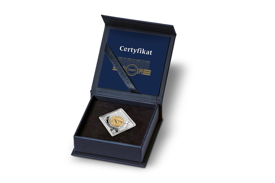 Srebrna moneta kolekcjonerska, w kształcie klipy (40 x 40 mm), oksydowana, selektywnie złocona, w stanie I, umieszczona w kapslu ochronnym i w etui, z certyfikatem.
