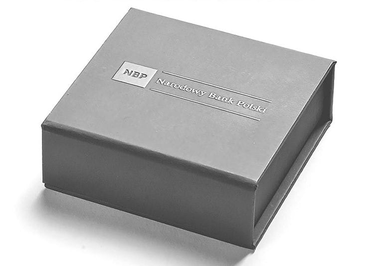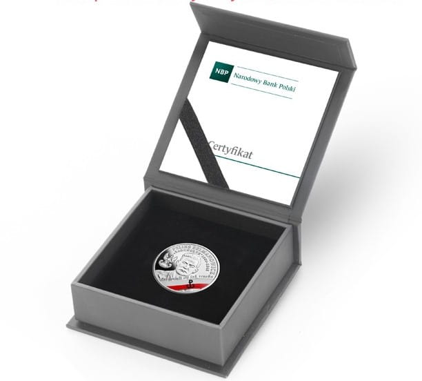 Srebrna moneta kolekcjonerska, wybita stemplem lustrzanym, z tampondrukiem, w stanie I, prosto z pudełka bankowego, umieszczona w kapslu ochronnym i etui, z certyfikatem.