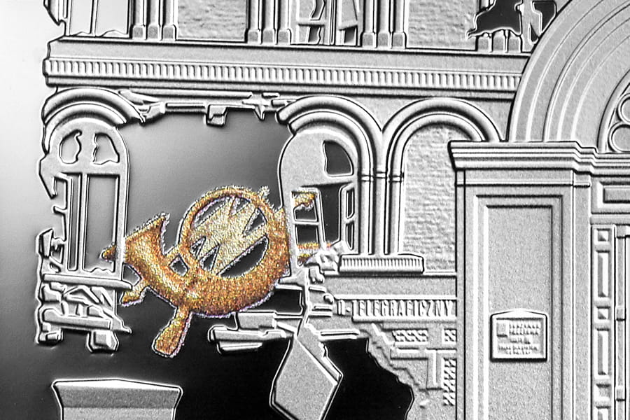 Srebrna moneta kolekcjonerska, w kształcie znaczka pocztowego, wybita stemplem lustrzanym, z drukiem UV, w stanie I, prosto z pudełka bankowego, umieszczona w kapslu ochronnym i etui, z certyfikatem.