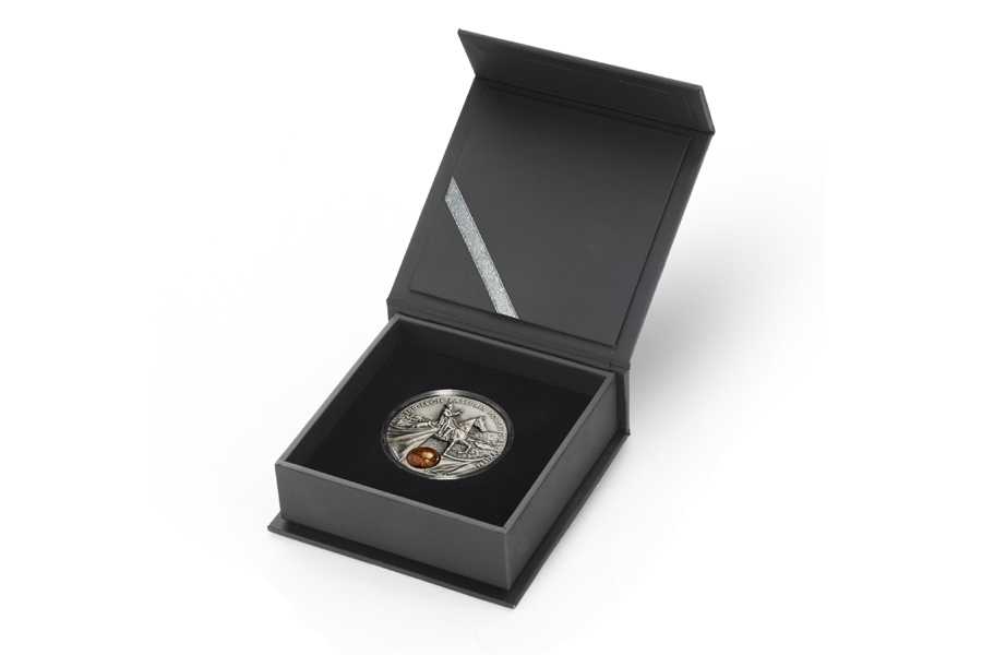 Srebrna moneta kolekcjonerska, oksydowana, z bursztynem, w stanie I, umieszczona w kapslu ochronnym i etui, z certyfikatem.