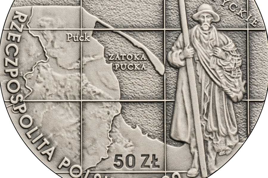 Awers: przedstawia odzyskaną część Pomorza, ograniczoną przez terytorium Niemiec oraz rybaka kaszubskiego ze zwojem sieci i z długim wiosłem, charakterystycznym dla regionu i okresu historycznego.