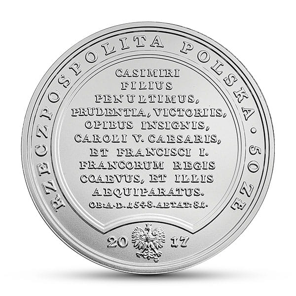Na awersie monety czytamy nieznacznie skrócony tekst z rewersu medalu (w tłumaczeniu): "Przedostatni syn Kazimierza, odznaczający się roztropnością, zwycięstwami i majątkiem, współczesny Karolowi V cesarzowi i Franciszkowi I królowi francuskiemu, i im równy. Umarł Roku Pańskiego 1548, mając lat 81, w 42. roku panowania, dnia 1 kwietnia."