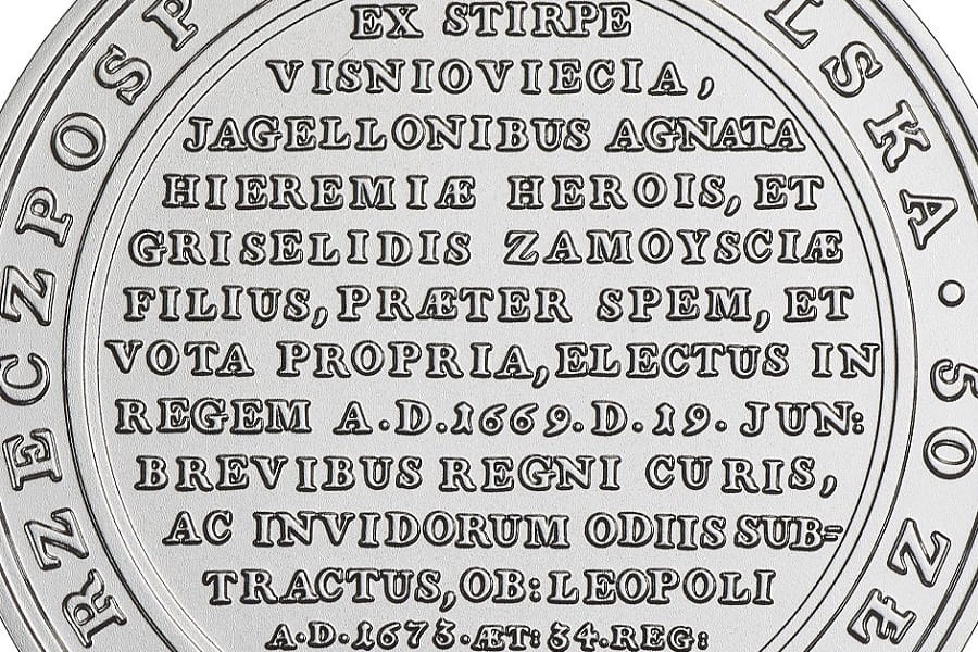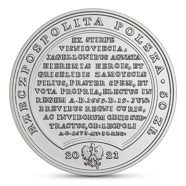 Na awersie monety czytamy tekst z rewersu medalu (w tłumaczeniu): Z rodu Wiśniowieckich, spokrewnionego z Jagiellonami, syn Jeremiego, bohatera, i Gryzeldy Zamoyskiej, wbrew własnej woli i nadziei, obrany na króla Roku Pańskiego 1669, dnia 19 czerwca, stargany troskami krótkiego królowania i nienawiścią zazdrosnych, umarł we Lwowie Roku Pańskiego 1673, mając lat 34, w 4. roku panowania, dnia 11 listopada.