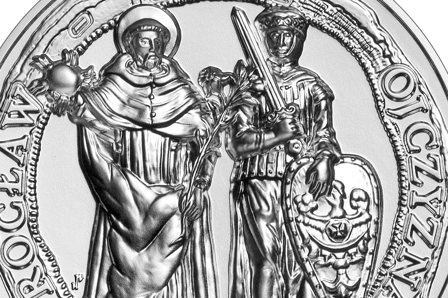 Rewers: na rewersie monety znalazły się postacie dominikanina bł. Czesława Odrowąża i księcia Henryka Pobożnego.