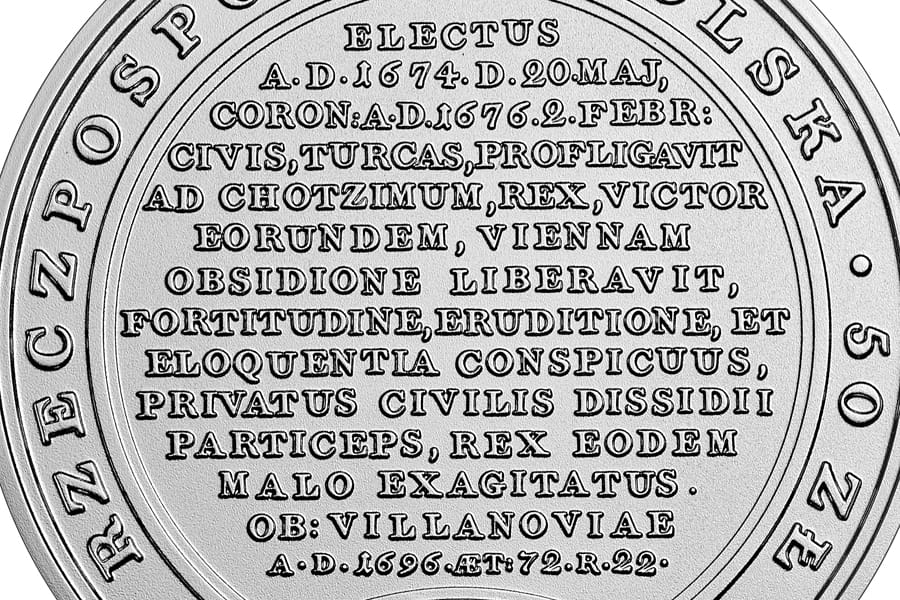 Obrany Roku Pańskiego 1674 dnia 20 maja, koronowany Roku Pańskiego 1676 dnia 2 lutego, jako poddany [króla Michała] pobił Turków pod Chocimiem, jako król zwyciężał tychże, uwolnił Wiedeń od oblężenia, znamienity męstwem, wykształceniem i wymową, jako poddany był uczestnikiem wewnętrznych zamieszek, jako król dręczony był tym samym nieszczęściem. Umarł w Wilanowie Roku Pańskiego 1696, mając lat 72, w 22. roku panowania, dnia 17 czerwca.