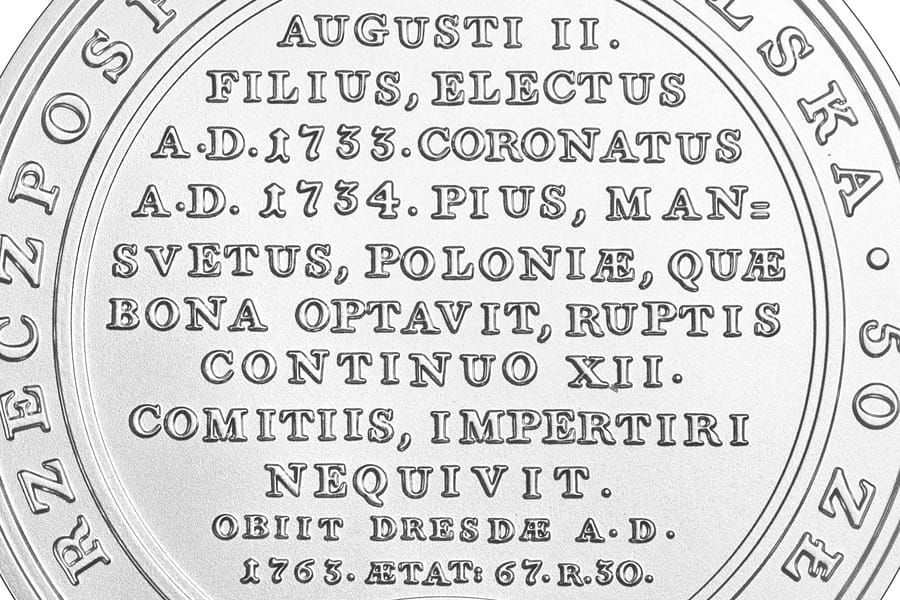 Awers: w otoku, od lewej strony do prawej, napis: RZECZPOSPOLITA POLSKA i po oddzielającej perełce napis: 50 ZŁ; u dołu wizerunek orła ustalony dla godła Rzeczypospolitej Polskiej, po bokach orła oznaczenie roku emisji: 20-23. Centralnie, na wyodrębnionej płaszczyźnie, napis: AUGUSTI II. / FILIUS, ELECTUS / A.D. 1733. CORONATUS / A.D. 1734. PIUS, MAN= / SVETUS, POLONIA, QUA / BONA OPTAVIT, RUPTIS / CONTINUO XII. / COMITIIS, IMPERTIRI / NEQUIVIT. / OBIIT DRESDA A.D. / 1763. ATAT: 67. R. 30, zakończony kropką. Pod orłem, po prawej stronie, znak mennicy: m / w.