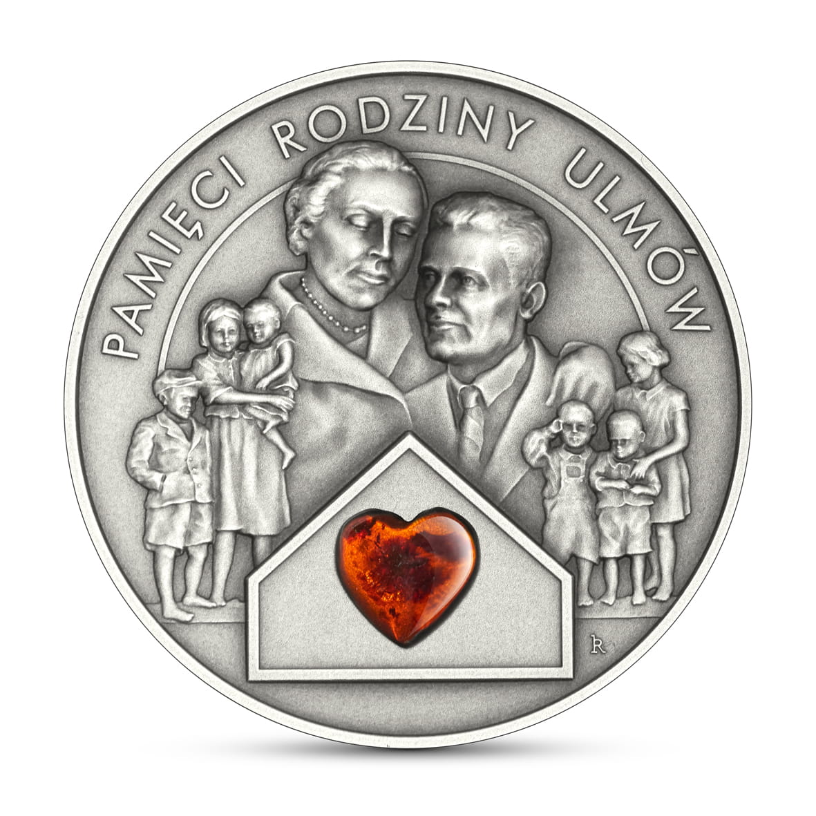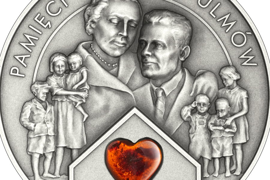 Rewers: przedstawia Błogosławioną Rodzinę Ulmów – Józefa i Wiktorię oraz dzieci: Stanisławę, Barbarę, Władysława, Franciszka, Antoniego i Marię. Bursztyn w kształcie serca symbolizuje siódme dziecko.