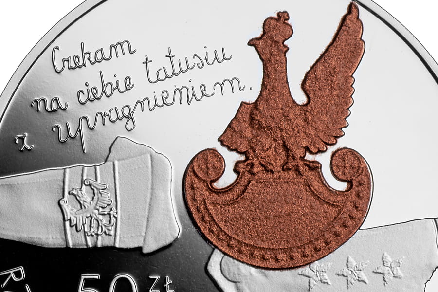 Awers: z prawej strony wizerunek orła Wojska Polskiego wzoru 1919, z ułamanym skrzydłem, wydobytego z dołów śmierci w Charkowie. Z lewej strony odwzorowany fragment korespondencji z kartki pocztowej wysłanej przez rodzinę do jednego z jeńców o treści: Czekam / na ciebie tatusiu / z upragnieniem, zakończony kropką. Z lewej i prawej strony naramienniki Policji Województwa Śląskiego i Wojska Polskiego. Poniżej naramiennika z lewej strony napis: 50 ZŁ. U dołu wizerunek orła ustalony dla godła Rzeczypospolitej Polskiej, pod orłem, po prawej stronie, znak mennicy: m / w; wzdłuż dolnego brzegu półkolem napis: RZECZPOSPOLITA POLSKA 2025.