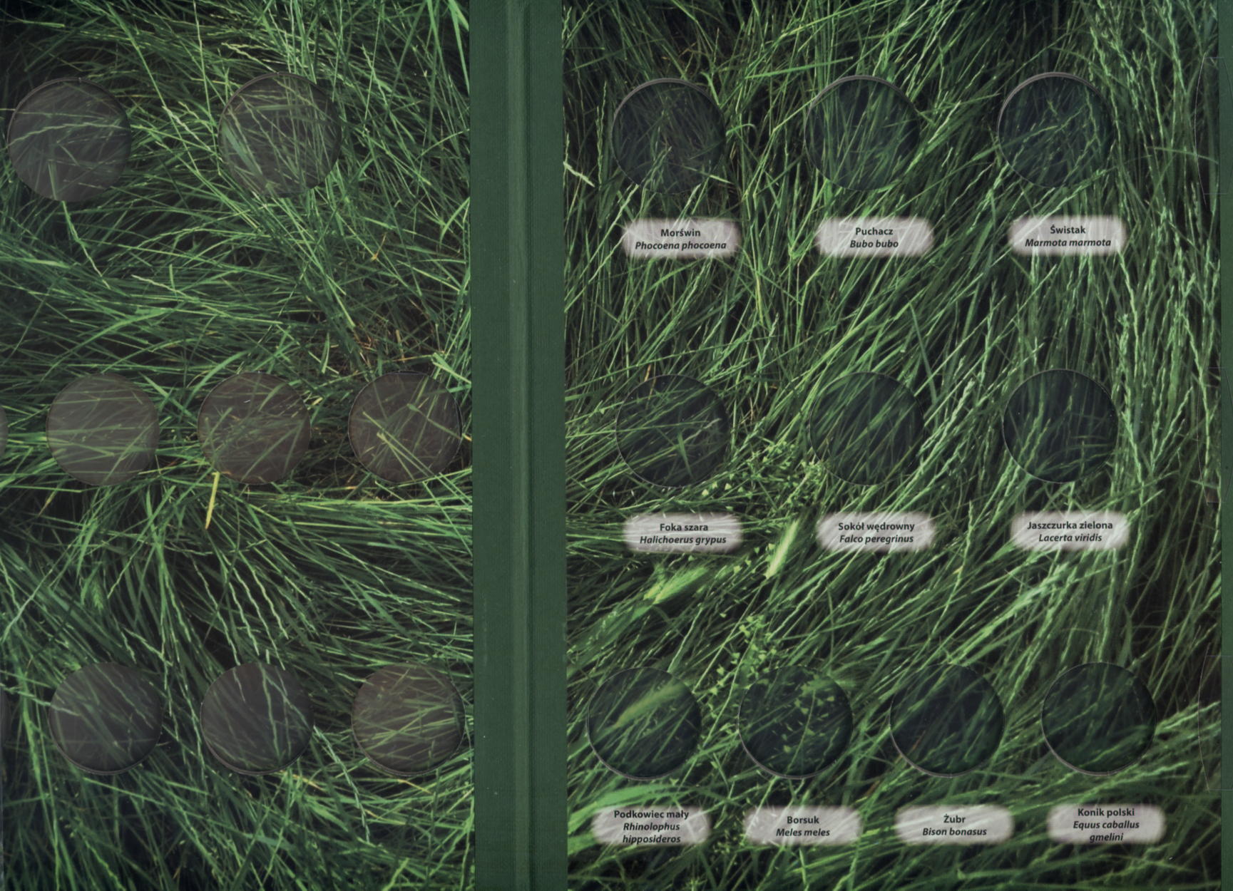 Album na dwadzieścia monet z serii Zwierzęta Świata emitowanych w latach 1993-2014: Jaskółki (20.000 zł / CuNi), Sum (2 zł CuNi); pozostałe monety ze stopu Golden Nordic: Jeż, Jelonek Rogacz, Ropuch Paskówka, Wilk, Dudek, Paź Królowej, Żółw Błotny, Węgorz Europejski, Morświn, Puchacz, Świstak, Foka Szara, Sokół Wędrowny, Jaszczurka Zielona, Podkowiec Mały, Borsuk, Żubr, Konik Polski.