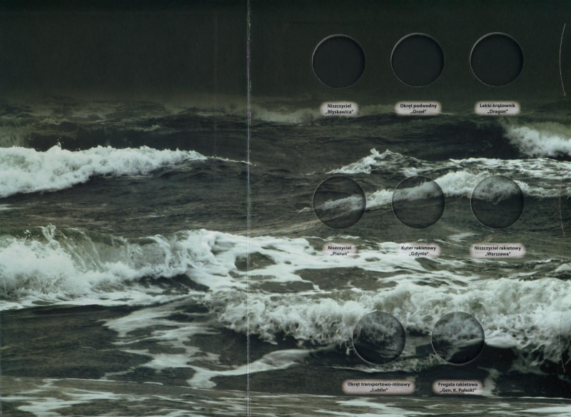 Kompletny album z ośmioma monetami 2 zł z serii Polskie Okręty emitowanymi w latach 2012-2013: Błyskawica, Orzeł, Dragon, Piorun, Gdynia, Warszawa, Lublin, Gen. K. Pułaski.