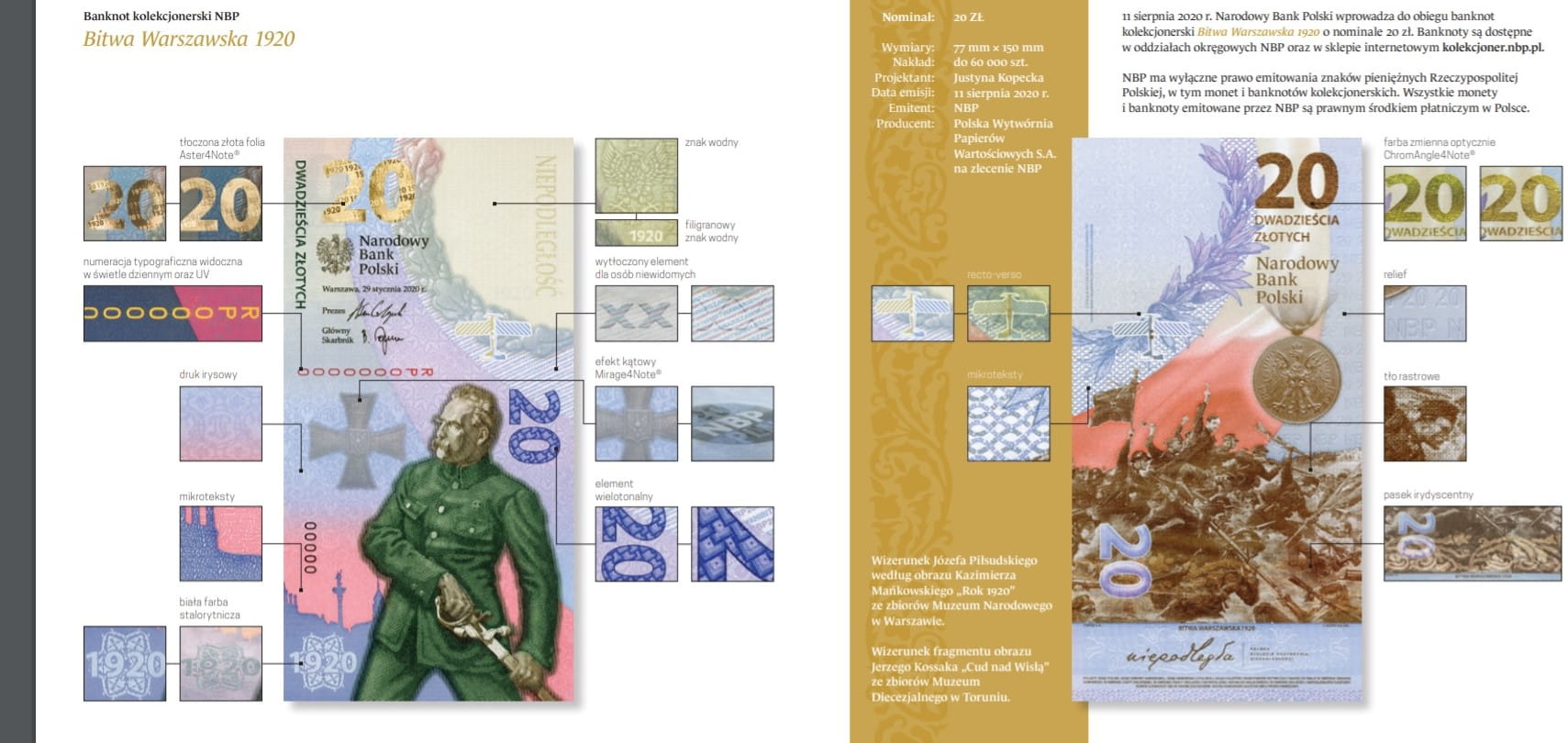 W setną rocznicę wielkiego polskiego zwycięstwa nad bolszewikami w Bitwie Warszawskiej Narodowy Bank Polski wyemitował banknot kolekcjonerski w formacie pionowym. Na przedniej stronie banknotu przedstawiono postać Józefa Piłsud - skiego. Wizerunek został zaczerpnięty z obrazu Kazimierza Mańkow - skiego pt. „Rok 1920”. Naczelnika Państwa ukazano jako obrońcę Warszawy. Na dalszym planie widnieją zarysy charakterystycznych warszawskich budowli. Z kolei zaprezentowany tu awers Krzyża Walecznych – z polskim orłem, napisem „Na polu chwały” i datą 1920 – jest odwołaniem do zbiorowego wysiłku polskiego żołnierza oraz czasu ustanowienia tego odznaczenia w kluczowym momencie zmagań pod Warszawą. Przednią stronę banknotu uzupełniają napis NIEPODLEGŁOŚĆ, wpisa - ny w wieniec z liści dębu, oraz elementy graficzne i motywy roślinne znajdujące się na banknotach marek polskich, w tym wizerunek orła i monogram RP widniejące na banknocie 100 marek polskich z 1919 r. Na odwrotnej stronie banknotu, pod barwami narodowymi, przedsta - wiono środkowy fragment obrazu Jerzego Kossaka pt. „Cud nad Wi - słą”. Wyobraża scenę symboliczną – księdza Ignacego Skorupkę wio - dącego do ataku żołnierzy formacji ochotniczych. Całość dopełniają wieniec z liści wawrzynu, medal pamiątkowy za wojnę 1918–1921 (errata do obwoluty banknotu) oraz fragment odezwy Rządu Obrony Narodowej „Ojczyzna w niebezpieczeństwie” z 5 sierpnia 1920 r. Bitwa Warszawska była przełomowym momentem wojny z bolsze - wikami. Zwycięstwo okrzyknięto Cudem nad Wisłą, a pomoc w suk - cesie przypisano opiece Najświętszej Maryi Panny, której świętoWniebowzięcia przypadło na kulminacyjny moment zmagań. Zasłu - gi w zakresie dowodzenia należy przypisać zarówno naczelnemu wodzowi Józefowi Piłsudskiemu, jak i szefowi sztabu generałowi Tadeuszowi Rozwadowskiemu oraz generałom Władysławowi Si - korskiemu – dowódcy 5 armii, Józefowi Hallerowi – dowódcy Armii Ochotniczej walczącej na przedpolach Warszawy i Maxime’owi Wey - gandowi. Zwycięstwo było możliwe dzięki zjednoczeniu narodu oraz poświęceniu polskich żołnierzy powstrzymujących bolszewicką na - wałę. Wśród nich wyróżniły się formacje złożone z ochotników, w tym gimnazjalistów i studentów, którzy odpowiedzieli na apel „Ojczyzna w niebezpieczeństwie”. Szczególną postacią był skromny ksiądz Ignacy Skorupka. W wielu wyobrażeniach i w legendzie jest prezen - towany jako ten, który poległ, prowadząc z krzyżem w ręku żołnierzy do boju. Postać Skorupki uosabia obrońcę cywilizacji zachodniej i chrześcijaństwa przed niszczycielską rewolucją bolszewicką. Do legendy przeszły zażarte starcia na przedmościu warszawskim pod Radzyminem i Ossowem w połowie sierpnia 1920 r. Równie waż - ne były zmagania Frontu Północnego i walki nad Wkrą oraz decydu - jące uderzenie wyprowadzone znad Wieprza. Nie bez znaczenia były osiągnięcia polskiego radiowywiadu. Zwycięstwo pod Warszawą utrwaliło jednak głównie mit Józefa Piłsudskiego – wskrzesiciela państwa i zwycięskiego wodza. To on stworzył koncepcję przeprowadzenia bitwy i kierował decydującym uderzeniem znad Wieprza. A zwycięstwo było doniosłe! Już współ - cześni podkreślali jego znaczenie, a Edgar Vincent D’Abernon nazwał Bitwę Warszawską „osiemnastą decydującą bitwą w dziejach świata”. Pod Warszawą ocalono bowiem nie tylko niepodległość Polski, lecz także zatamowano ekspansję bolszewizmu na Europę.