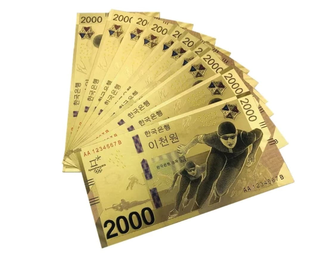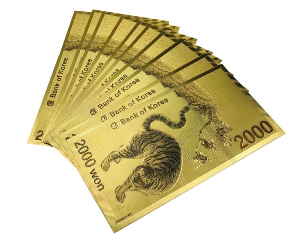 Korea 2000 won. Banknot złocony grubości 0,4 mm, wykonany ze sztywnej, złoconej folii. Nie jest on środkiem płatniczym, posiada jedynie walory kolekcjonerskie i dekoracyjne.